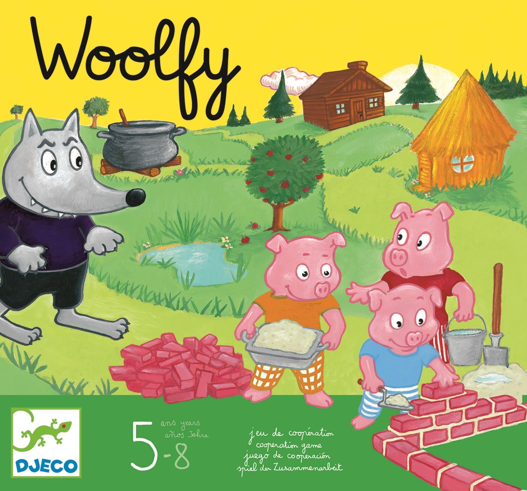 Woolfy est un jeu de coopération pour les Merveilles. Au départ, on place 3 petits cochons et le loup sur le plateau. Chaque joueur lance à tour de rôle un dé rouge, vert ou bleu et avance le cochon correspondant. Si le dé montre une constellation ou le loup, ce dernier se déplace. La victoire est remportée lorsque les merveilles ont construit la maison de briques et libéré le cochon de la marmite.